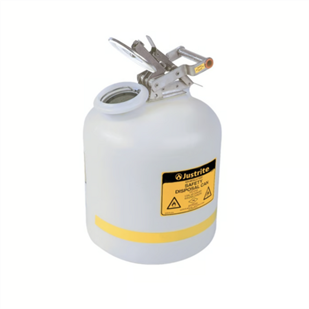 Högdensitetspolyeten (HDPE) avfallskärl ger överlägsen kemikalieresistens och läckageskydd. Det fjäderbelastade förseglade locket, normalt stängt, ventilerar automatiskt mellan 3 och 5 psi (0,2 och 0,35 bar). Handtag och beslag i rostfritt stål med ett låssystem håller locket i öppet läge för enkel påfyllning och hällning. Den stora öppningen har en inbyggd flamskyddare i rostfritt stål för att skydda mot antändning utifrån. En strömförande, patenterad kolfiberinsats inbäddad i behållaren möjliggör korrekt jordning. Den breda basdesignen ger stabilitet och motverkar oavsiktlig omkullvältning.