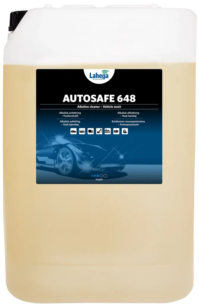 Autosafe 648 är ett kraftfullt, medelskummande alkaliskt avfettningsmedel från Lahega, framtaget för professionell fordonstvätt och industriell rengöring. Löser snabbt upp fet smuts, trafikfilm och vägsmuts med låg metallpåverkan. Späds 1:7–1:20 med vatten. Finns i 5, 25 och 205 liters förpackning.