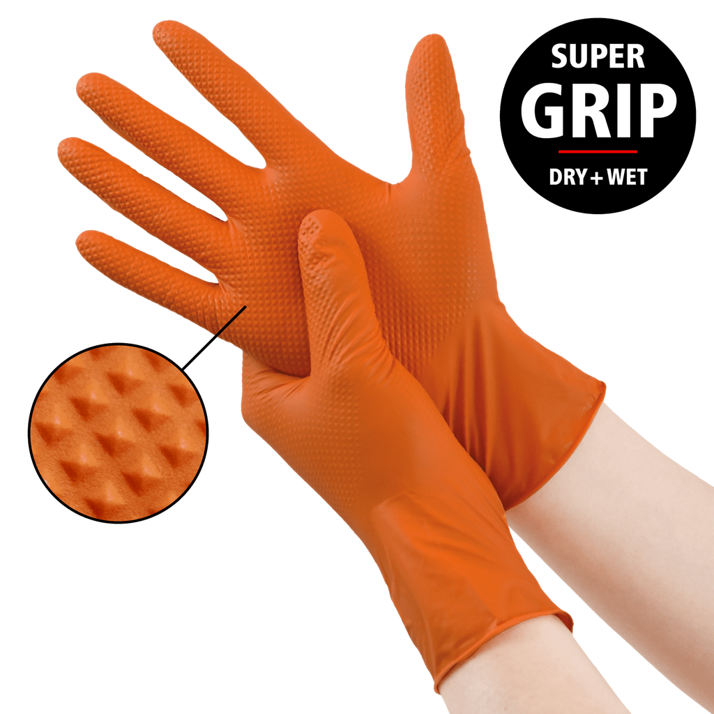 Slitstarka nitrilhandskar med diamantstruktur som ger ett säkert grepp i både våta och torra miljöer. Extra tjockt material ger hög motståndskraft mot slitage och kemikalier, samtidigt som den ergonomiska passformen säkerställer komfort vid långvarig användning. Latexfria, puderfria och lämpliga för krävande arbetsmiljöer.