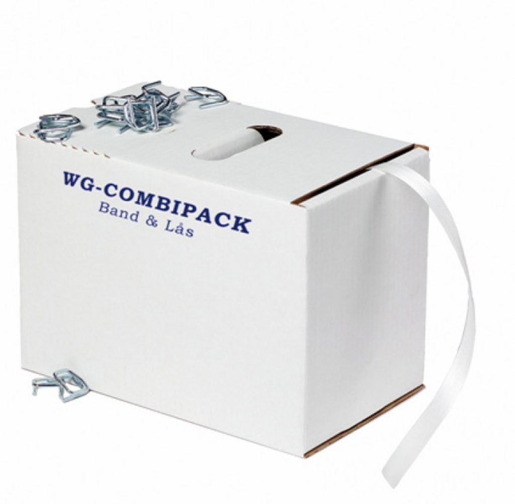 "Packband VG‑16 Allt‑i‑ett vit 16 mm x 200 m + 80 spännen är en komplett och användarvänlig lösning för manuell bandning, godsfixering och buntning. Förpackningen innehåller ett robust VG‑band i vitt med 16 mm bredd och 200 m längd tillsammans med 80 metallspännen – precis vad du behöver för att buntband att fästa ordentligt utan att använda specialverktyg. VG‑bandet är tillverkat av slitstark polyester som ger stark hållfasthet och bra grepp runt lasten, samtidigt som metallspännen säkerställer att allt sitter säkert. Detta gör produkten utmärkt för fixering av pallar, paket, buntar eller andra material som behöver trygg stabilisering inför transport eller lagerhantering. Tack vare det smarta “allt‑i‑ett”‑konceptet med band och spännen i samma förpackning får du en kostnadseffektiv och lättanvänd packlösning som sparar tid och gör arbetet mer effektivt. Oavsett om du jobbar i ett lager, distributionscenter eller butiksmiljö så gör detta packband jobbet enklare och mer pålitligt."