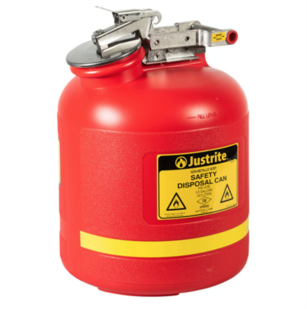 "Justrites icke-metalliska säkerhetsbehållare för laboratorier kombinerar fördelarna med Type I polyetens säkerhetskärl och en extra funktion för enkel dispensering genom en självstängande kran. Varje påfyllningspip är utrustad med ett tryckavlastningslock och en flamspärr i rostfritt stål, vilket ger ökad säkerhet vid hantering av farliga vätskor. Kärlens överdel har även rostfria ståldelar för maximal korrosionsbeständighet och lång hållbarhet, vilket gör dem särskilt lämpade för kemiskt aggressiva miljöer. För 19-litersmodellen (5 gallons) finns dessutom en vakuumavlastningsventil i locket som säkerställer ett jämnt och smidigt flöde av vätskor, vilket underlättar vid dispensering. Justrites unika, patenterade kolinsats, som är inbäddad i behållaren, möjliggör korrekt jordning, vilket ytterligare förbättrar säkerheten när antändbara vätskor hanteras. De icke-metalliska hyllkärlen har en kran monterad 5 cm ovanför botten för att undvika att kärlen behöver lyftas vid dispensering, vilket minskar risken för spill och ökar användarvänligheten. Alla kärl är FM-godkända, vilket innebär att de uppfyller höga standarder för brandsäkerhet och hållbarhet, och de är idealiska för laboratoriemiljöer som kräver säker hantering av kemikalier och andra farliga ämnen."