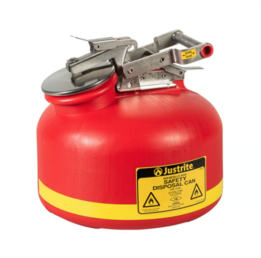 Avfallsbehållare i högdensitetspolyeten (HDPE) ger överlägsen kemikalieresistens och skydd mot läckage. Det fjäderbelastade, tättslutande locket är normalt stängt men ventilerar automatiskt vid ett tryck mellan 3 och 5 psi (0,2 och 0,35 bar), vilket förhindrar farligt övertryck. Behållaren är utrustad med ett rostfritt stålhandtag och beslag samt ett låssystem som håller locket öppet för enkel påfyllning och tömning. Den stora öppningen har en inbyggd flamspärr i rostfritt stål som skyddar mot extern antändning. En patenterad kolinsats, inbäddad i behållaren, möjliggör korrekt jordning för säker hantering av brandfarliga vätskor. Den breda basen ger extra stabilitet och förhindrar att behållaren oavsiktligt välter.