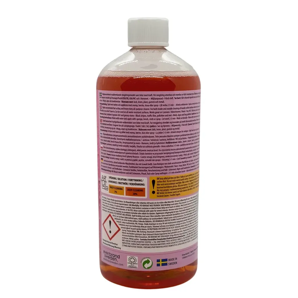 Tar bort: Ingrodd smuts, fettfläckar, svarta ränder, mögel, alger, insektsrester Skonsam mot: Lack, krom, plast, akrylplast, gummi, metall Passar för: Båt, bil, MC, husvagn, husbil, kök, badrum – alla vattentåliga ytor Format: Koncentrat, 1000 ml Utspädning: 1:19 (5 %) daglig rengöring / 1:4 (20 %) djuprengöring Art.nr: 8311 Tillverkare: Everbrand Sweden / Sharkbite® Miljö: Miljöanpassad, fräsch doft.