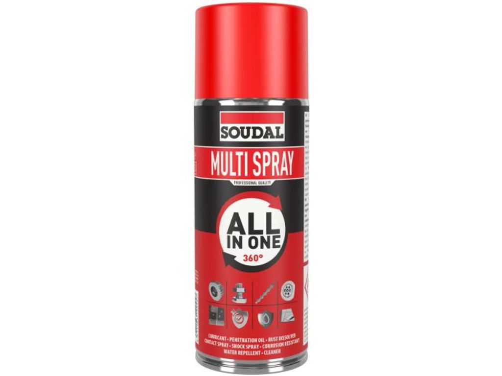 Soudal Multi Spray är en högkvalitativ universalspray med åtta funktioner i en och samma produkt: den smörjer, rengör, tränger in, löser rost, skyddar mot korrosion, avvisar fukt samt fungerar som kontakt- och shockspray. Produkten lämnar en skyddande film efter applicering som bidrar till långvarigt skydd av behandlade ytor.