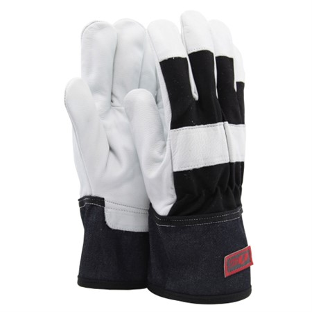 Traditionell halvfodrad arbetshandske som är sydd i getskinn. Handsken är fingertoppsförstärkt med ovanhand i vävt bomullstyg. Krage i kraftig bomull och pulsåderskydd i getskinn. Knogförstärkt. I handsken finns ett tunt bomullsfoder. Handsken är en typisk allroundhandske.